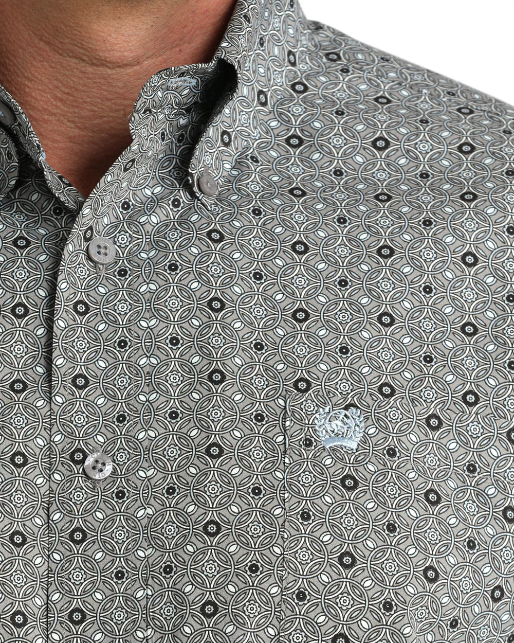 Refresh your fall wardrobe with a classic gray geometric printed CINCH shirt crafted from comfortable cotton plain weave. Designed to elevate your seasonal style, this shirt is finished with an open left front pocket, embroidered logo, and coordinating gray buttons, making it a perfect choice for the office or plans after sunset.